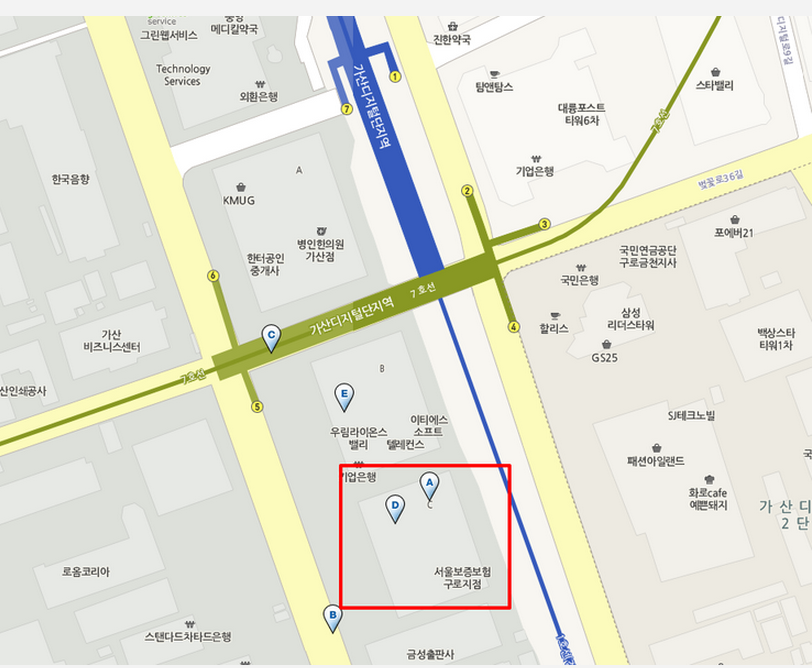 1/7호선 가산디지털단지지하철 역에서 지하로 바로 이어져 있는 우림 라이온스 밸리 건물입니다.